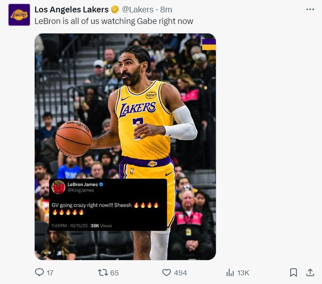 湖人官方写道,文森特刚刚连续命中了五个三分球。