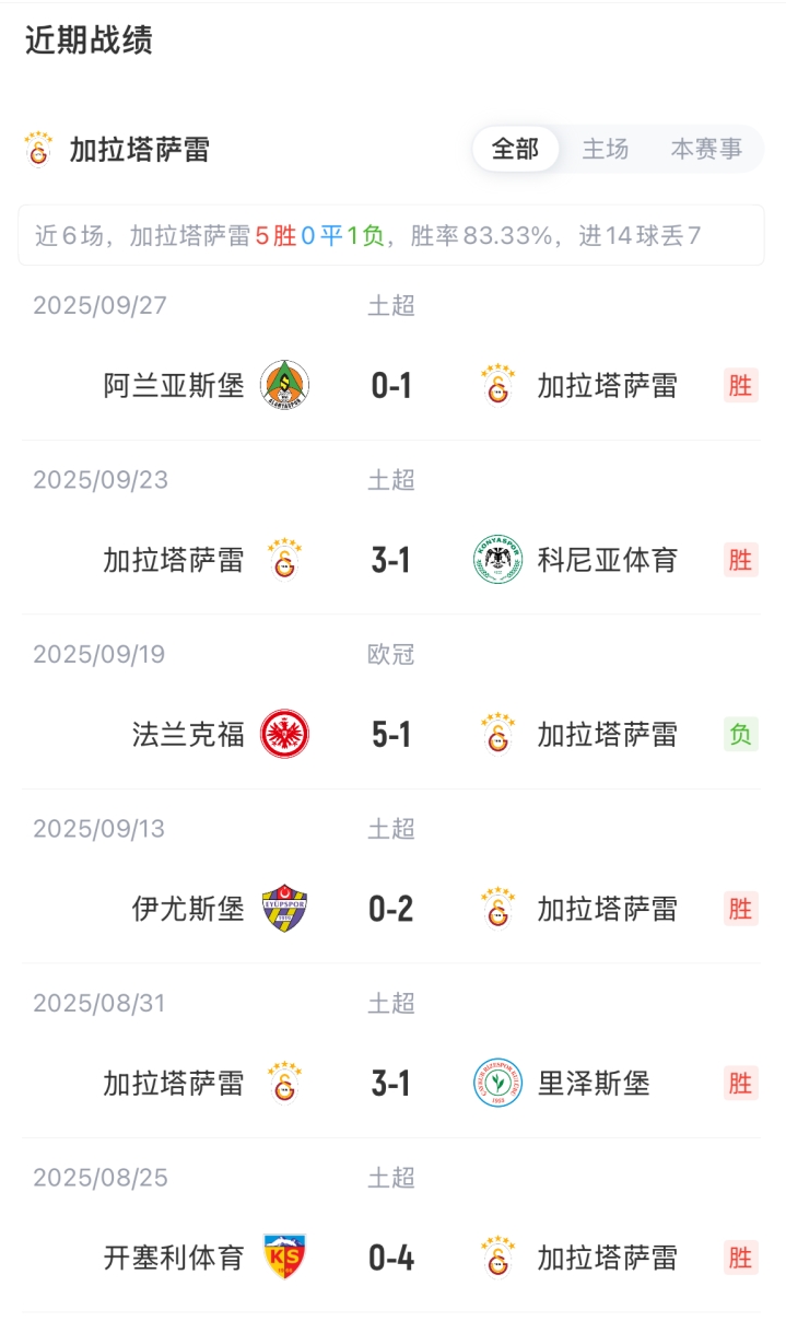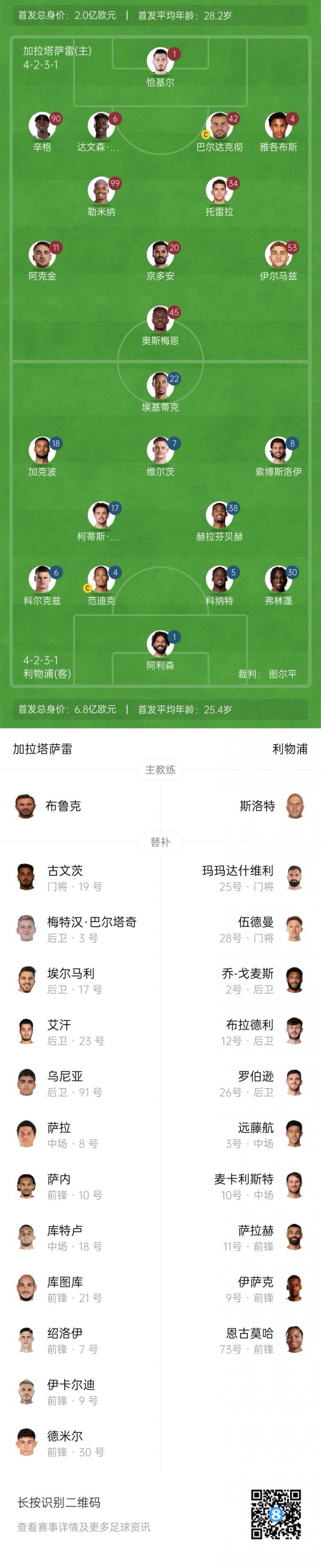 加拉塔萨雷首发:1-恰基尔、90-辛格、6-达文森·桑切斯、42-巴尔达什彻、4-伊斯梅尔-雅各布斯、34-托雷拉、99-勒米纳、11-阿克金、20-京多安、53-伊尔马兹、45-奥斯梅恩