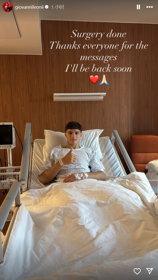 莱奥尼社媒:我已经完成手术,感谢大家的祝福信息,将很快回归